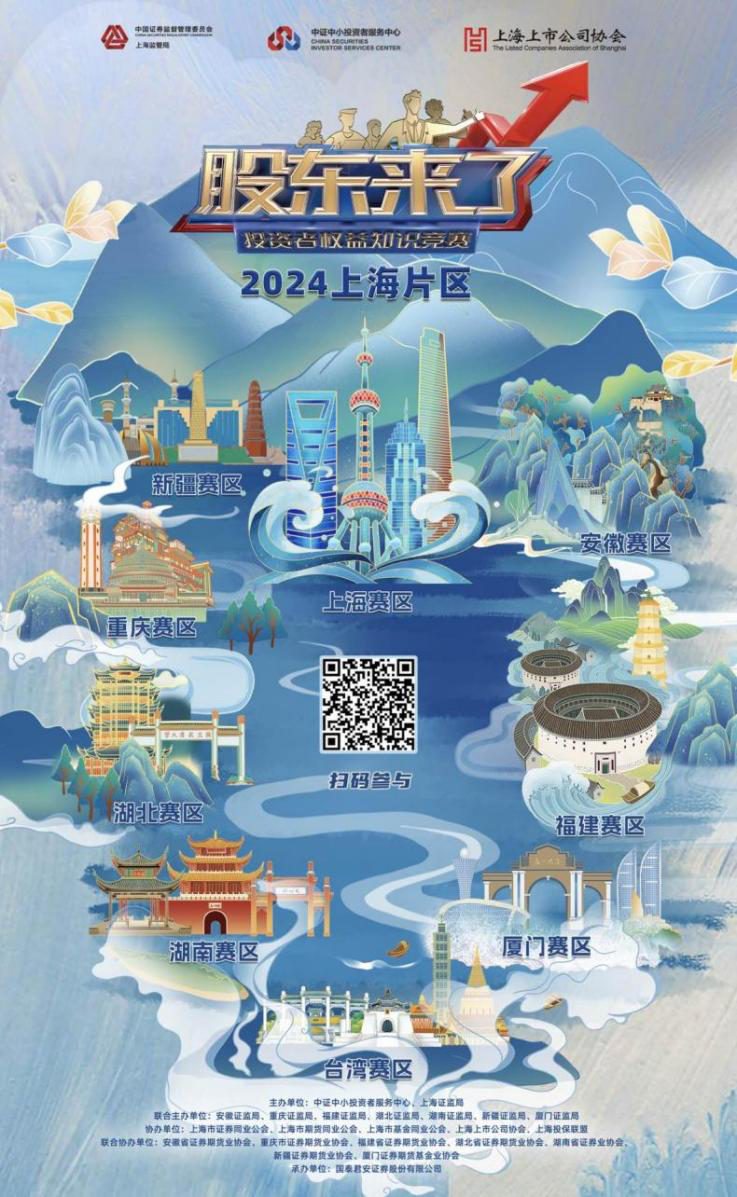 《股东来了》(2024)投资者权益知识竞赛由中证中小投资者服务中心联合上海、江苏、西藏、深圳四证监局共同举办,面向广大中小投资者普及权益知识,引导投资者全面知权、积极行权、依法维权。《股东来了》(2024)投资者权益知识竞赛上海片区活动正式启动,欢迎广大投资者扫描上海证券业协会专属二维码(见下)一起参与注册答题!