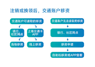 2、原卡交通账户可读取的,全市社区网点、本行指定受理网点当场完成移资;或在办理注销或换卡手续后次日,通过实名注册的上海交通卡APP移资(打开上海交通卡APP-我的-维修卡-社保卡移资,将资金余额转移到APP钱包内)。原卡交通账户无法读取的,完成移资申请7个工作日后到交通卡自助服务设备移资(圈存)或登录上海交通卡APP查看钱包资金到账情况。操作过程中如遇问题,请拨打交通卡服务热线962319。