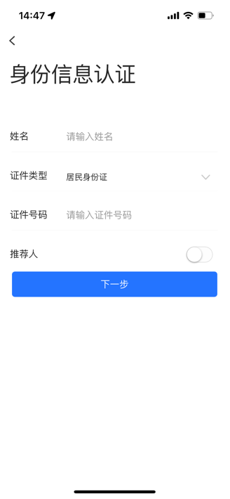 4、录入身份认证信息(姓名、证件号),并点击下一步。